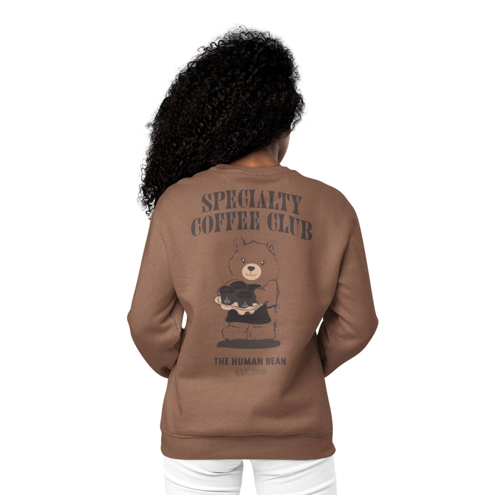 Stay cozy in this Vintage Brown unisex crewneck, featuring The Human Bean square logo on the front and a playful bear “Specialty Coffee Club” design on the back. Made with a super-soft poly-cotton fleece blend, it offers a relaxed retail fit with dropped shoulders, ribbed cuffs, and a comfy waistband. This apparel is perfect for layering or lounging with your favorite brew.